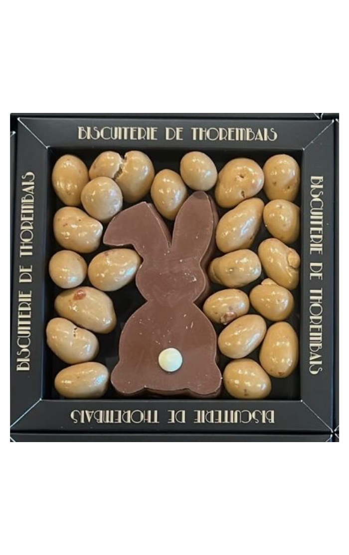 Un coffret 100% gourmand, composé d'un lapin en chocolat gianduja feuilletine, et des amandes enrobées de chocolat Dulcey.